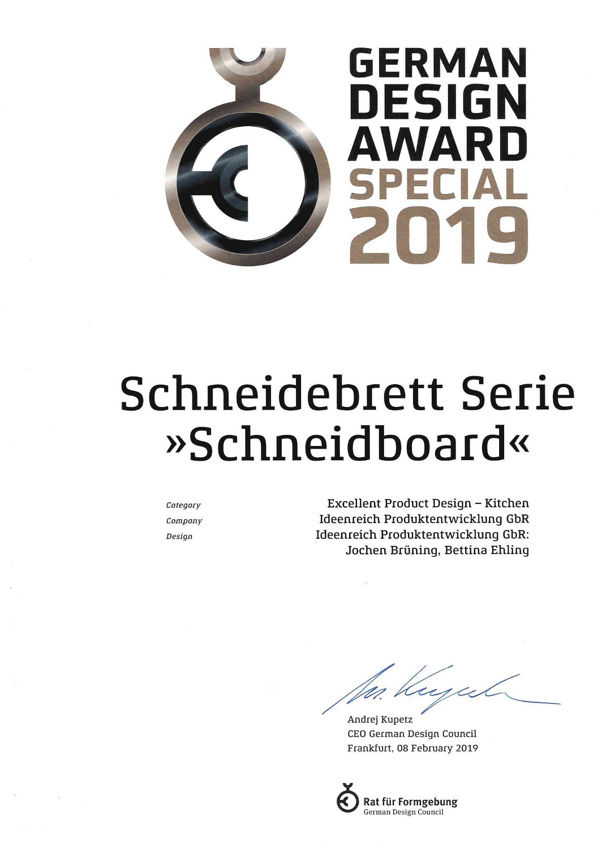 Unser Design Schneidebrett mit German Design Award Auszeichnung