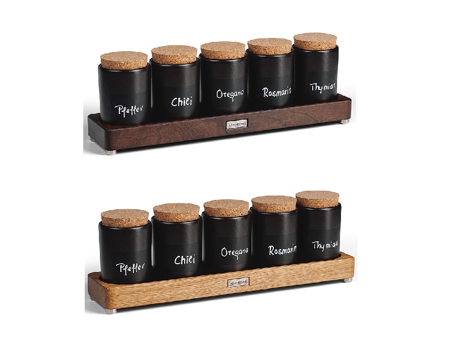 Gewürze sind wunderschön verstaut im Set inklusive der Massivholzleiste aus Nussbaum oder Eiche. Luftdicht und vor Feuchtigkeit geschützt sind sie praktisch verstaut, aber dennoch stets griffbereit auf Küchenarbeitsplatte oder Esstisch. Die Gwürzdosen sind in schwarzmatt und weißmatt erhältlich und egal in welcher Kombination mit Eiche oder Nussbaumleiste ein wunderschöner Blickfang.