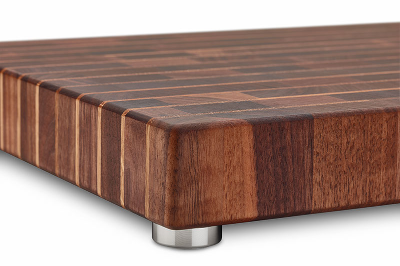 Ein Schneidebrett kann mehr als nur Schneidunterlage sein. Mehr als 100 Stirnholzelemente aus Nussbaum, versehen mit 12 Eichenlisenen handwerklich verarbeitet, mehrfach fein geschliffen und handgeölt, veredelt mit Edelstahlfüssen machen aus einem Schneidebrett ein Designelement, das auch in Deiner Küche der Hingucker sein wird.