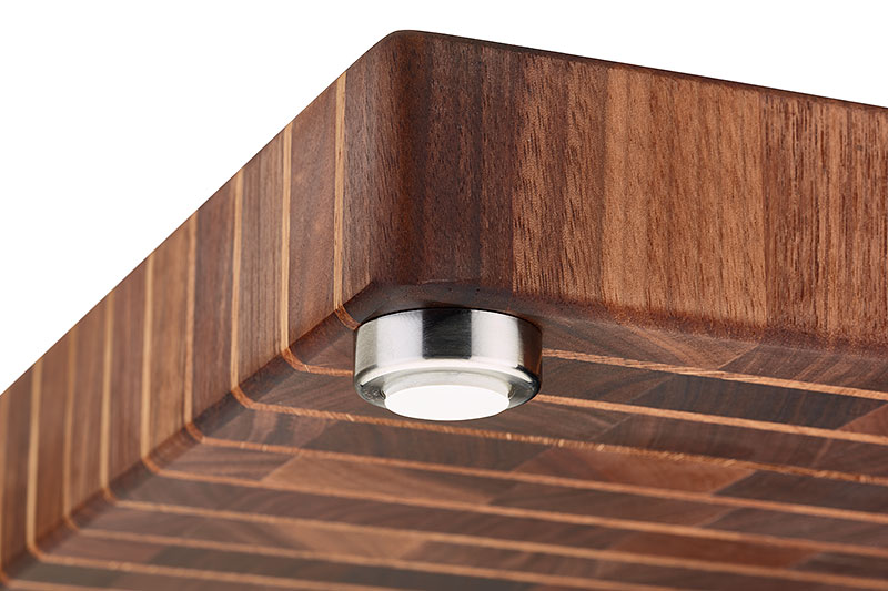 Die Füße sind speziell für die Hackbretter aus massivem Edelstahl gedreht und mit einer lebensmittelechten Gummierung versehen worden, daher ist das Hackbrett Premium absolut standfest. Durch diese Konstruktion entsteht unter dem Holzbrett ein Luftspalt von 10 mm, wodurch das wichtige Trocknen des Schneidbrettes stets gewährleistet ist. Zudem ermöglicht dieser Zwischenraum ein leichtes Greifen und praktisches Handling Dank des Gerbsäureanteils hat Nussbaum von Natur aus eine antibakterielle Wirkung !