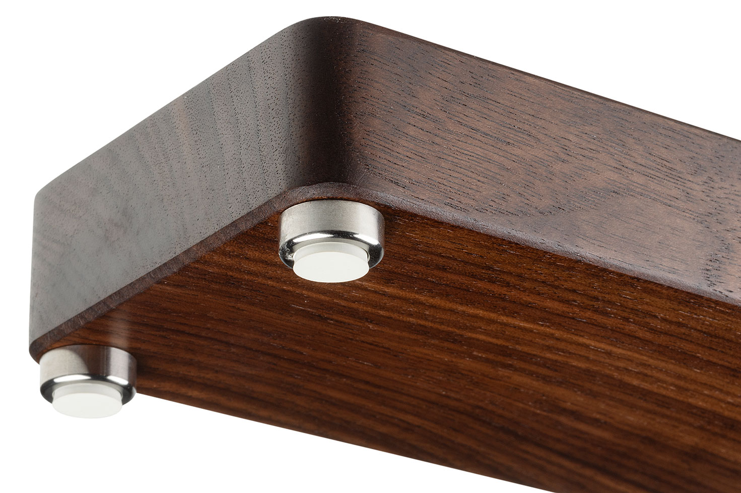 Unter dem Gewürzregal aus Nussbaum sind vier formschöne Edelstahlfüßchen angebracht. Diese verleihen dem Board ein besonderes Design und sorgen für Standfestigkeit. Durch die eingearbeiteten lebensmittelechten Gummironden steht es sicher auf jedem Untergrund, ohne Kratzspuren zu hinterlassen. Zudem ermöglicht der Spalt, der durch die Füßchen entsteht, ein leichtes Greifen und Handeln.