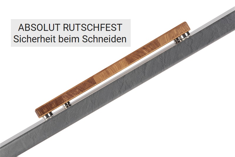 Die Füße sind speziell für die Schneidboards aus massivem Edelstahl gedreht und mit einer lebensmittelechten Gummierung versehen, daher ist das Schneidboard absolut standfest. Durch diese Konstruktion entsteht unter dem Holzbrett ein Luftspalt von 10 mm, wodurch das wichtige Trocknen des Schneidbrettes stets gewährleistet ist. Zudem ermöglicht dieser Zwischenraum ein leichtes Greifen und praktisches Handling. (siehe Video oben)