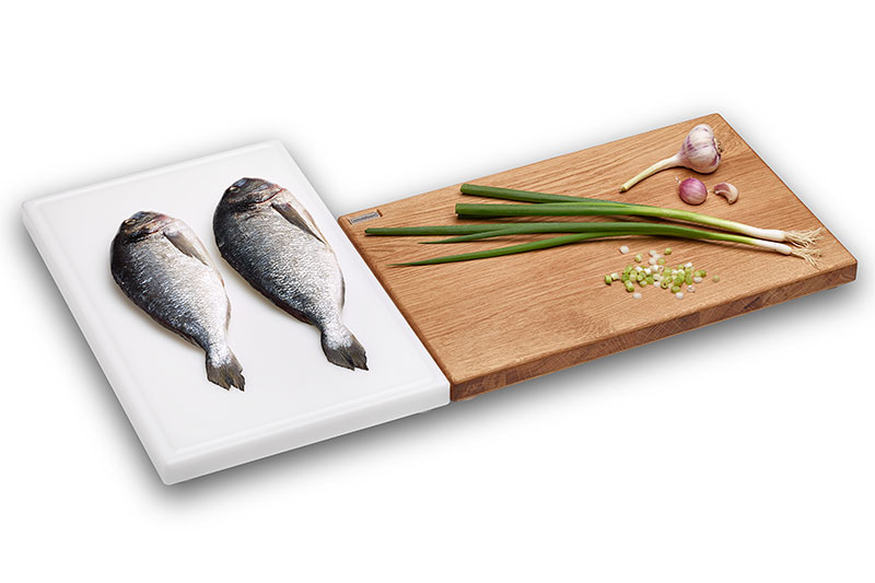 HOLZ UND KUNSTSTOFF-Schneidebrett-Set. Die Kombination aus Eichenholz und PE 500-Kunstststoff gibt Dir die Möglichkeit die passende Schneidunterlage frei wählen zu können.