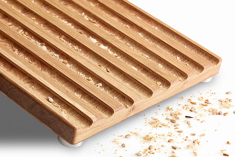 Acht 19 mm breite und 8 mm tiefe Rillen sorgen für eine gute Aufnahme von abfallenden Brotkrümmeln. Auf der einen Seite des Brettes sind die Rillen geschlossen, auf der rechten Seite wurden die Rillen durchgefräst, so dass Öffnungen entstehen, die ein leichtes Reinigen des Brettes ermöglichen.