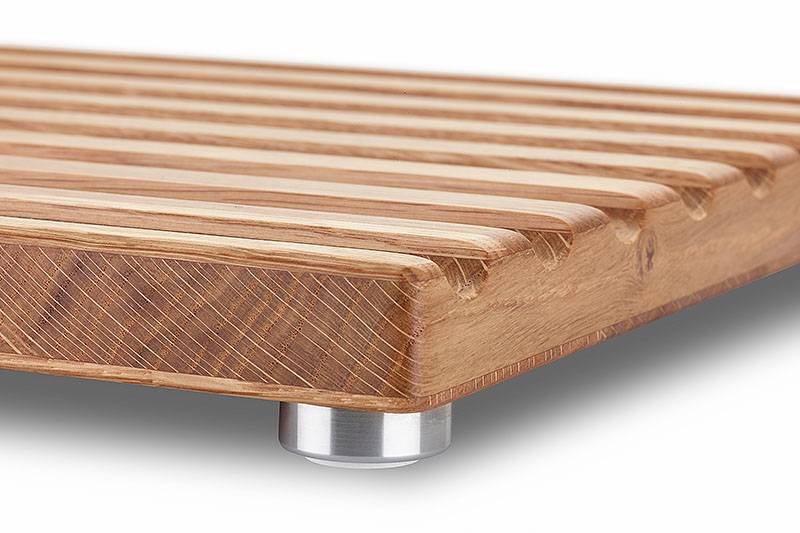 Die Füße sind speziell für die Brotschneidebretter aus massivem Edelstahl gedreht und mit einer lebensmittelechten Gummierung versehen, daher ist das Schneidboard absolut standfest. Durch diese Konstruktion entsteht unter dem Holzbrett ein Luftspalt von 10 mm, wodurch das wichtige Trocknen des Schneidbrettes stets gewährleistet ist. Zudem ermöglicht dieser Zwischenraum ein leichtes Greifen und praktisches Handling.