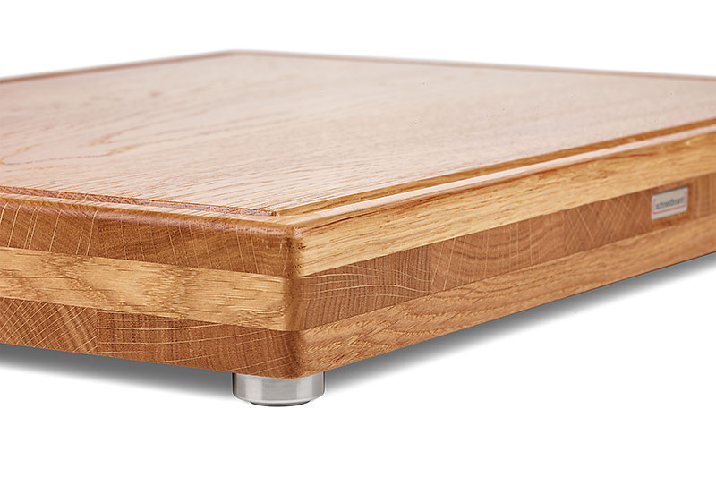 Damit das Holz gerade bleibt, ist der Brettaufbau bei unseren Premium Schneidboards immer 3-lagig. Die Ober- und die Unterlage sind längs, die Mittellage ist quer verleimt. Diese Fertigungsart kommt aus dem hochwertigen Möbelbau und wird immer da eingesetzt, wo das Holz sich nicht verziehen soll. Fest montierte und gummierte Edelstahlfüsse sorgen nicht nur für einen sicheren Stand, es entsteht auch ein praktischer Griff- und Luftspalt. Der Luftspalt sorgt automatisch für eine Luftzirkulation, damit das Brett stets trocknen kann, das ist hygienisch und so haben Keime keine Chance. Die Brettstärke von 5 cm lassen das Schneidboard Premium Eiche MEDI S+ massiv und edel anmuten und dennoch ist es kompakt und handlich.