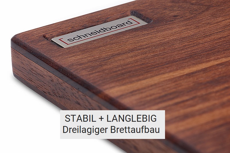 Damit das Holz gerade bleibt, ist der Brettaufbau bei unseren Frühstücksbrettchen Nussbaum immer 3-lagig. Die Ober- und die Unterlage sind längs, die Mittellage ist quer verleimt. Diese Fertigungsart kommt aus dem hochwertigen Möbelbau und wird immer da eingesetzt, wo das Holz sich nicht verziehen soll. Die passgenau eingearbeitete Edelstahlapplikation rundet die schöne Optik der Frühstückbrettchen Nussbaum ab.