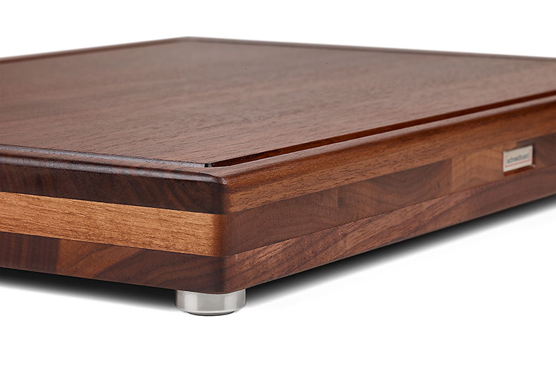 Die Füße sind speziell für die Schneidboards aus massivem Edelstahl gedreht und mit einer lebensmittelechten Gummierung versehen worden, daher ist das Schneidboard Premium absolut standfest. Durch diese Konstruktion entsteht unter dem Holzbrett ein Luftspalt von 10 mm, wodurch das wichtige Trocknen des Schneidbrettes stets gewährleistet ist.