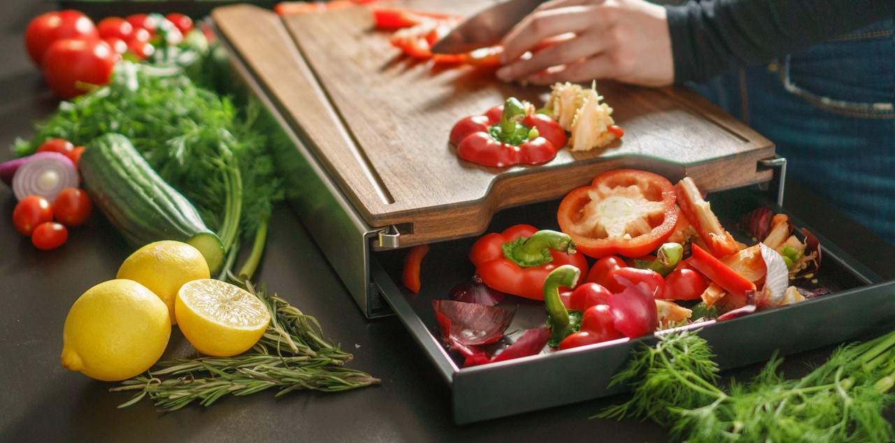 Das dreilagige Brett kann beidseitig genutzt werden. Die eine Seite ist mit einer Saftrille versehen, die nützlich für das Schneiden und Auffangen von Gemüse- oder Obstsäften ist. Die andere Seite ist glatt, was besonders hilfreich ist, wenn z.B. Kräuter geschnitten werden. Das Brett rastet durch die speziell gefertigte Edelstahlfeder immer fest auf dem Edelstahlkasten ein und verrutscht nicht. Der Aufbau der Schneidbox Eiche ist wie bei der Schneidbox Bambus und bei der Schneidbox Kunststoff der gleiche. Die Schneidbox wird durch das durchdachte System unter dem Schneidbrett zu einem nützlichen und platzsparenden Küchenhelfer. Eine große Schale für Abfälle und drei kleine Schalen für das Schnittgut bewegen sich auf zwei Ebenen im Edelstahlkasten und werden nur dann herausgezogen, wenn sie gebraucht werden. Für dieses Produkt werden ausschließlich hochwertige Rohstoffe verwendet, die leicht zu reinigen sind. Die Schneidbox Eiche kann komplett auseinander gebaut und somit gut verstaut oder separat benutzt werden. Der verwendete ABS Kunststoff für die Schubladen ist spülmaschinentauglich, zur Pflege von Holzschneidebrettern finden Sie Hinweise in unserem Ratgeber.