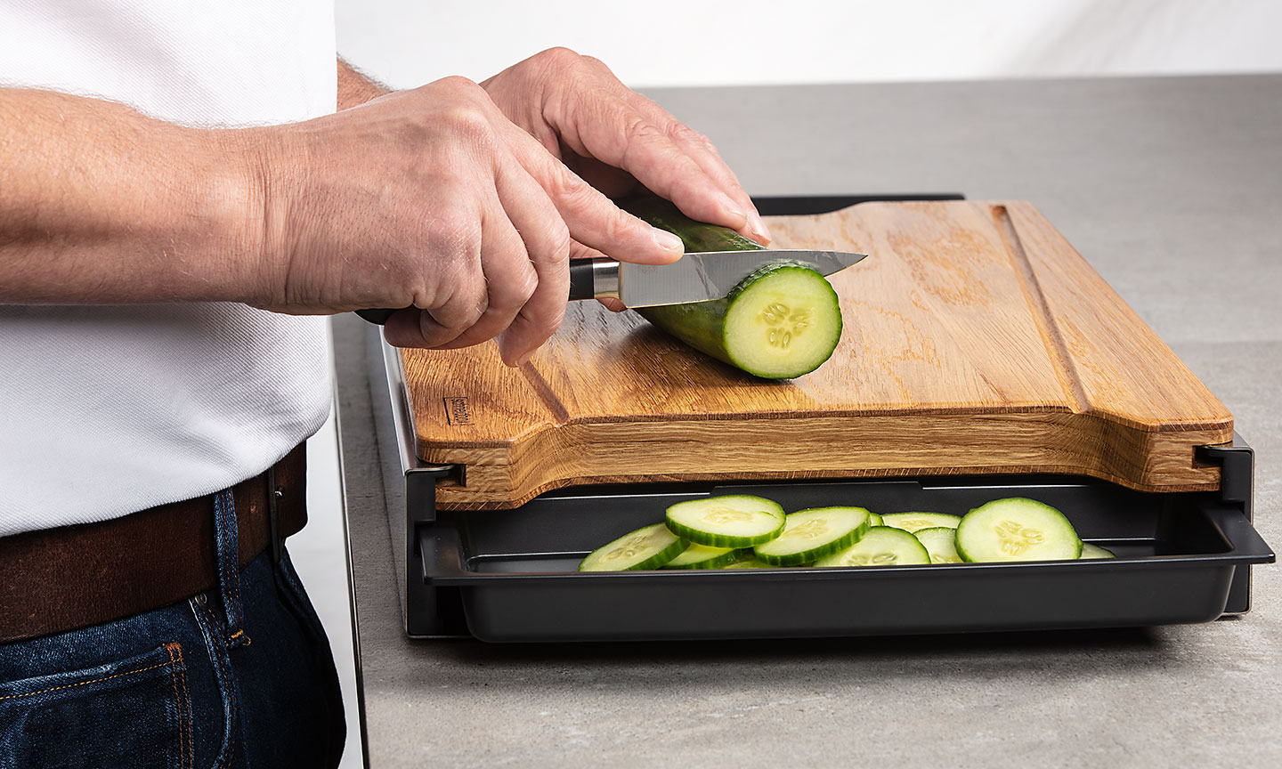 Schneidebrett mit 4 integrierten Auffangschalen in massiver Eiche