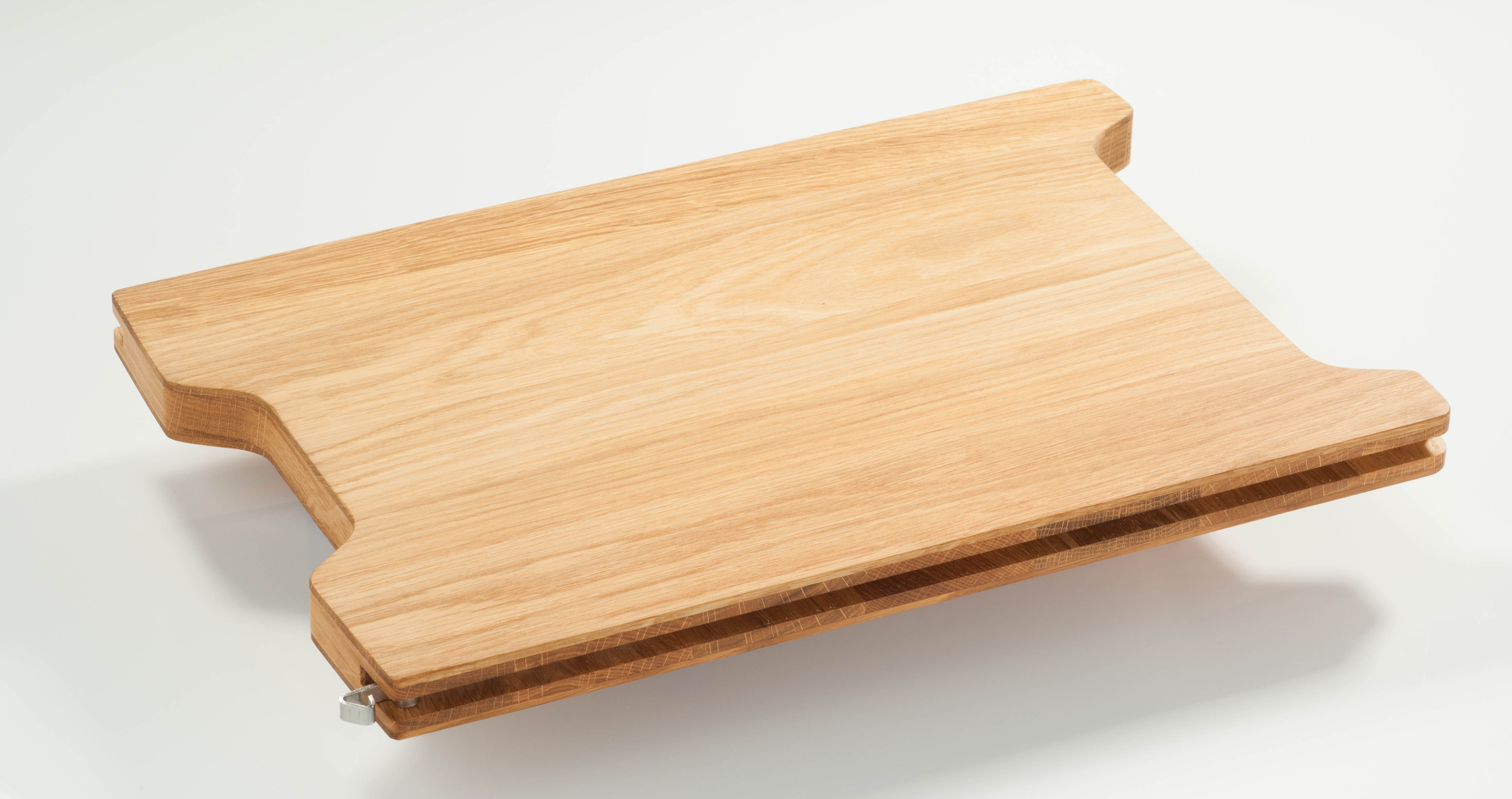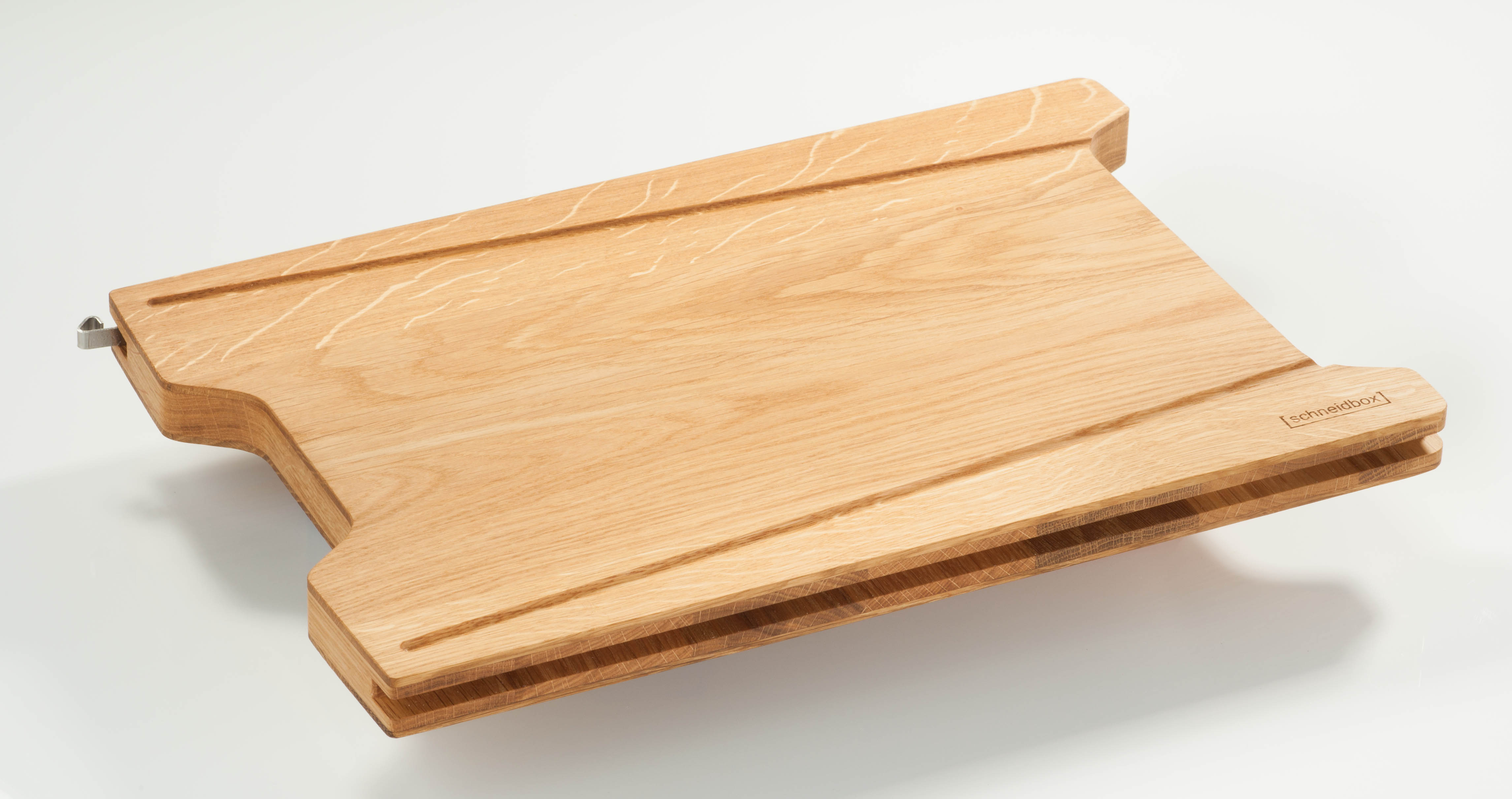 Dreilagig gearbeitetes Eichenbrett inkl. Edelstahlfeder zum Einrasten und kompatibel zur Schneidbox
