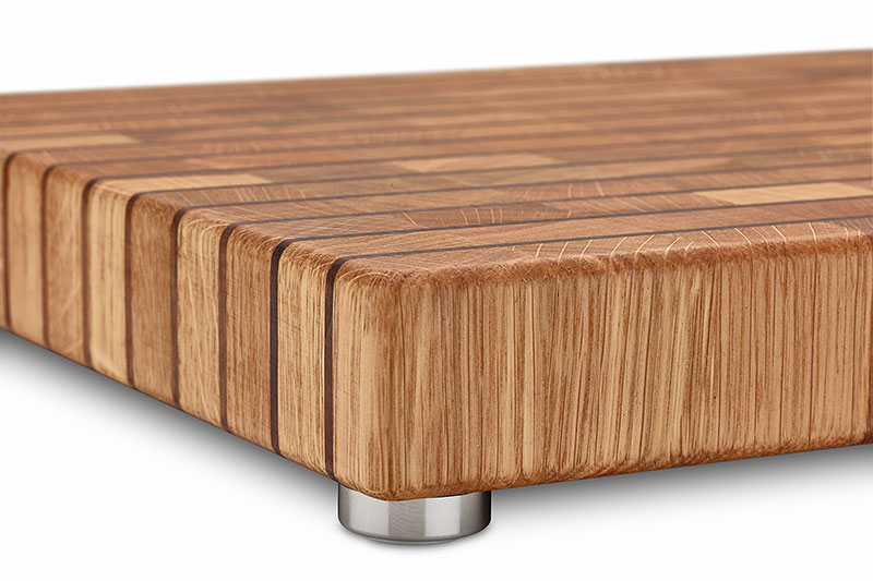 Bei Hirnholz, oder auch Stirnholz, gennant, stehen die Holzfasern, wie bei einer Bürste, aufrecht und können beim Schneiden nicht durchtrennt werden. Diese Verarbeitungsart macht das Hackbrett Eiche extrem stabil und langlebig. Hirnholz ist messerschonend und auch für hochwertige Messer bestens geeignet. Fest montierte und gummierte Edelstahlfüsse sorgen nicht nur für einen sicheren Stand, es entsteht auch ein praktischer Griff- und Luftspalt. Der Luftspalt sorgt automatisch für eine Luftzirkulation, damit das Brett stets trocknen kann, das ist hygienisch und so haben Keime keine Chance.