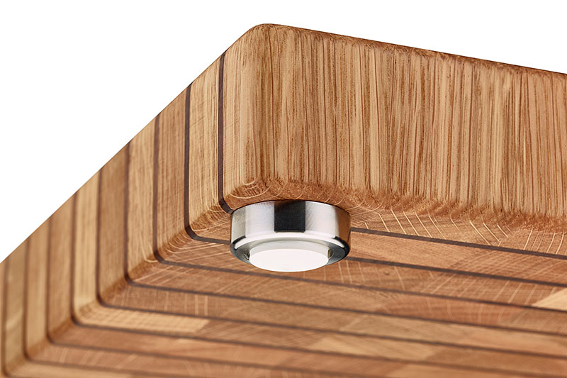 Die eingearbeiteten Nussbaum Lisenen verleihen den sonst eher robust wirkenden Hirnholzschneidebrettern, ein sehr edles und modernes Design.
