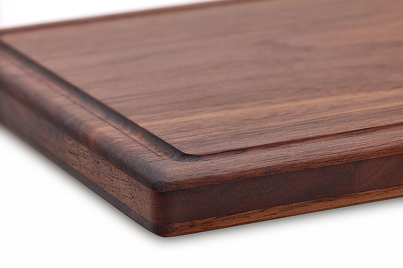 Damit das Holz gerade bleibt, ist der Brettaufbau bei unserem Zwiebelbrett Nussbaum immer dreilagig. Die Oberlage und die Unterlage sind längs, die Mittellage ist quer verleimt. Diese Fertigungsart kommt aus dem hochwertigen Möbelbau und wird immer da eingesetzt, wo das Holz sich nicht verziehen soll. Die einseitig umlaufende Saftrille von 5 mm Breite und 3 mm Tiefe ermöglicht das Auffangen von Säften.